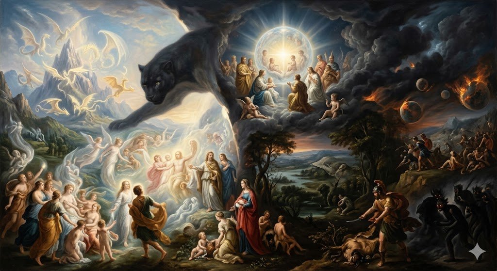 Comenzaron las guerras, y por donde las sombras pasaban, iban sembrando ira y rencor. Muchos se unieron a esta oscuridad, consumidos por su miedo, por su odio. Así pasaron miles de millones de años. La batalla continuó. El mismo aire se volvía más pesado, el ambiente se cubría en neblinas. El agua se evaporaba convirtiéndose en nubes negras y tormentosas. El mismo fuego consumía planetas enteros para después apagarse y dejar todo en completa oscuridad. La tierra, la madre Urantia, antes llena de luz, se poblaba de pantanos tenebrosos, de grandes sombras bajo los altos árboles de las selvas. El mito se convirtió en leyenda y la leyenda en recuerdo, en un recuerdo vivo, tan vivo como las imágenes que proyectan los espejos.